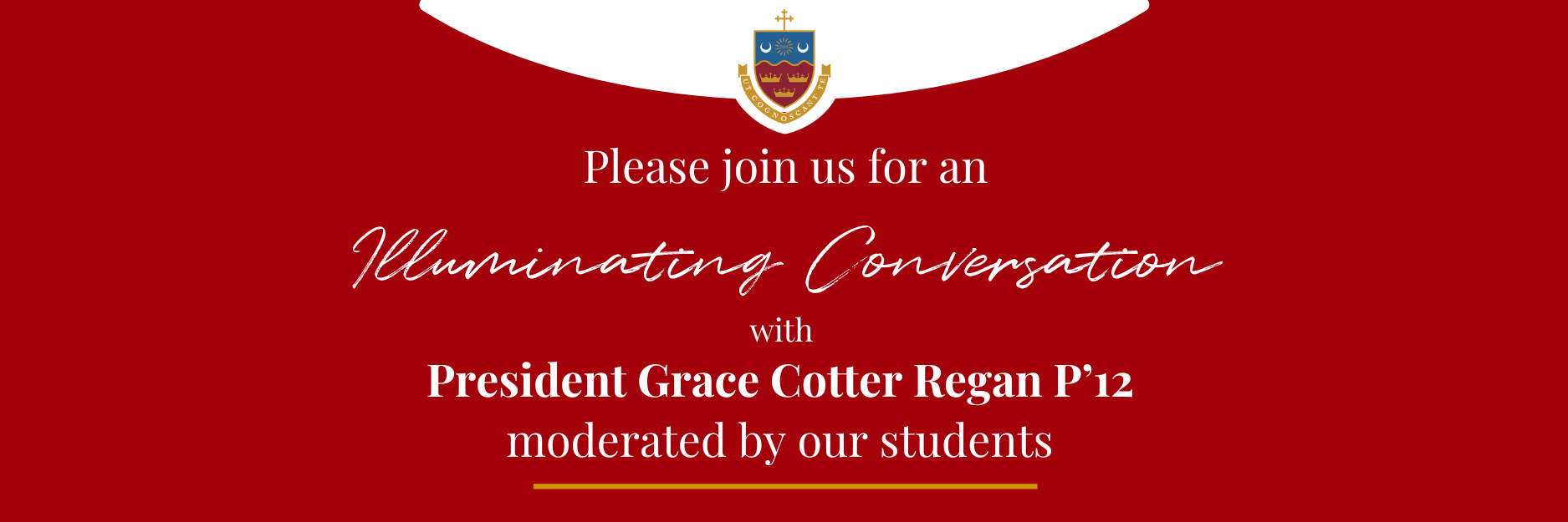 Please join us on Friday, January 31st at 8:00 a.m. for an Illuminating Conversation with President Grace Cotter Regan P'12 moderated by our students. Coffee and refreshments will be served.