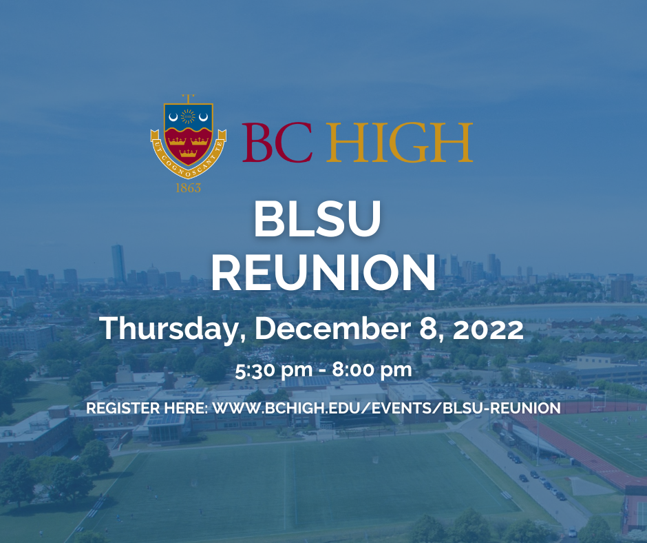 Please join us on Thursday, December 8th for BC High's inaugural BLSU Reunion! Enjoy a night filled with food, drinks, and a chance to connect with current BLSU students and fellow BLSU alumni. The night will feature a short speaking program and a special recognition of Nelson Miranda '92, P'16, '18, Mrs. Barbara O'Brien Miller P'91, '93, and Dr. Ruth Evee P'16, '18.