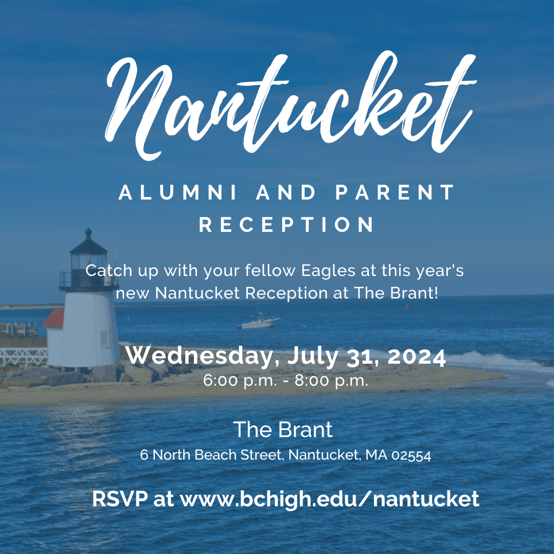 Events Nantucket Alumni and Parent Reception Wednesday, July 31, 2024 at 6:00PM The Brant, 6 North Beach Street, Nantucket, MA 02554 Share Please join President Grace Cotter Regan'12 and members of the Advancement team for our Nantucket Alumni and Parent Reception at The Brant Hotel on Wednesday, July 31, 2024. More Upcoming Events